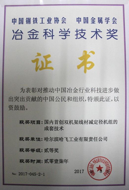 為表彰對推動中國冶金行業(yè)科技進(jìn)步做出的突出貢獻(xiàn),冶金科學(xué)技術(shù)獎獎勵委員會決定對78個項目授予2017年中國鋼鐵工業(yè)協(xié)會、中國金屬學(xué)會冶金科學(xué)技術(shù)獎,我公司“國內(nèi)首創(chuàng)雙機(jī)架線材減定徑機(jī)組的成套技術(shù)”獲得二等獎。我公司是冶金系統(tǒng)外的冶金設(shè)備制造商獲得此獎項,標(biāo)志雙機(jī)架線材減定徑機(jī)組成套技術(shù)對中國冶金行業(yè)科技創(chuàng)新、技術(shù)進(jìn)步有重要意義。